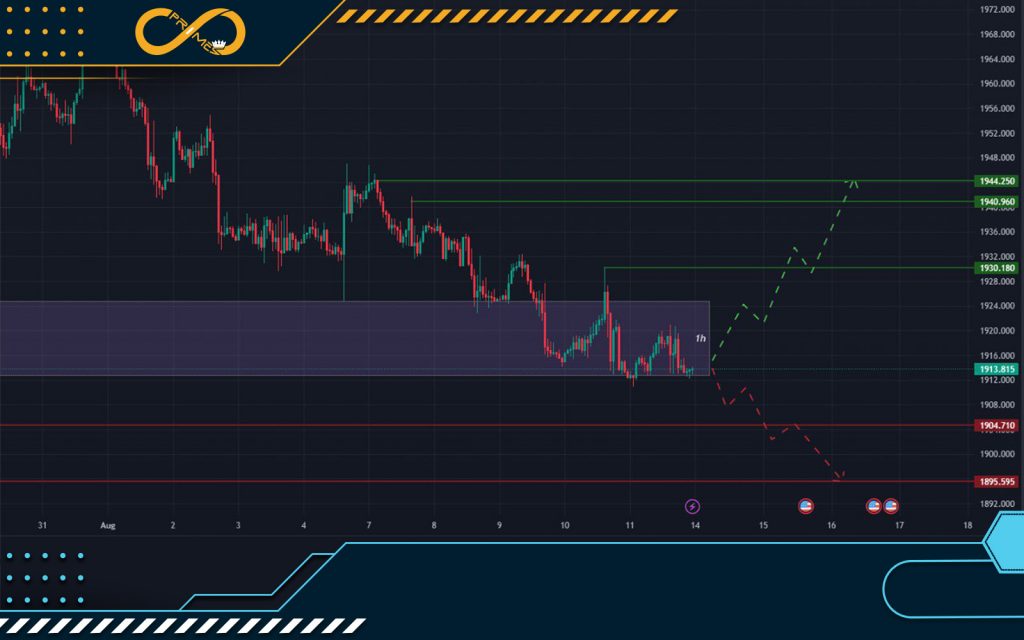 سناریو نزولی: XAUUSD درصورت شکست وتثبیت زیر محدوده 1910.900 انتظار می رود تا ناحیه 1904.710 و درصورت تداوم روند نزولی تا محدوده 1895.595 به اصلاح خود ادامه خواهد داد.