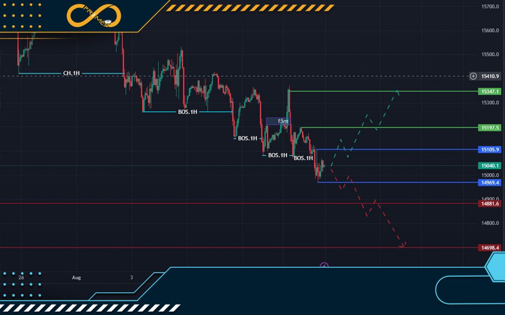 شاخص NASDAQ با برخورد به بلاک 1 ساعته 15828 روند اصلاحی خودش رو شروع کرد ودر حال حاضر روند 1 ساعته این شاخص نزولی هست و قیمت به محدوده تقاضای 14970 واکنش داده و در صورت تایید احتمال صعود رو داریم.